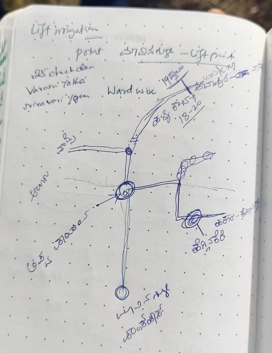 Our focus on the two days of November 5 and 6th was to get a glimmer of understanding of the water systems of Aluru Panchayat through mapping. We began the day with conversations with, what turned out to be the key members of the ಗ್ರಾಮ ನೀರು ಮತ್ತು ನೈರ್ಮಲ್ಯ ಸಮಿತಿ (Village Water and Sanitation Committee - VWSC) of Aluru and Harkuru, the two villages of the GP. We learned through the conversations before, during and after mapping that the VWSCs oversee the planning, utilising the funding (allotted from the yearly GP budget), and maintenance of the GP controlled water systems. They also negotiate with the forest department and irrigation departments for periodic water releases based on the need of the population.