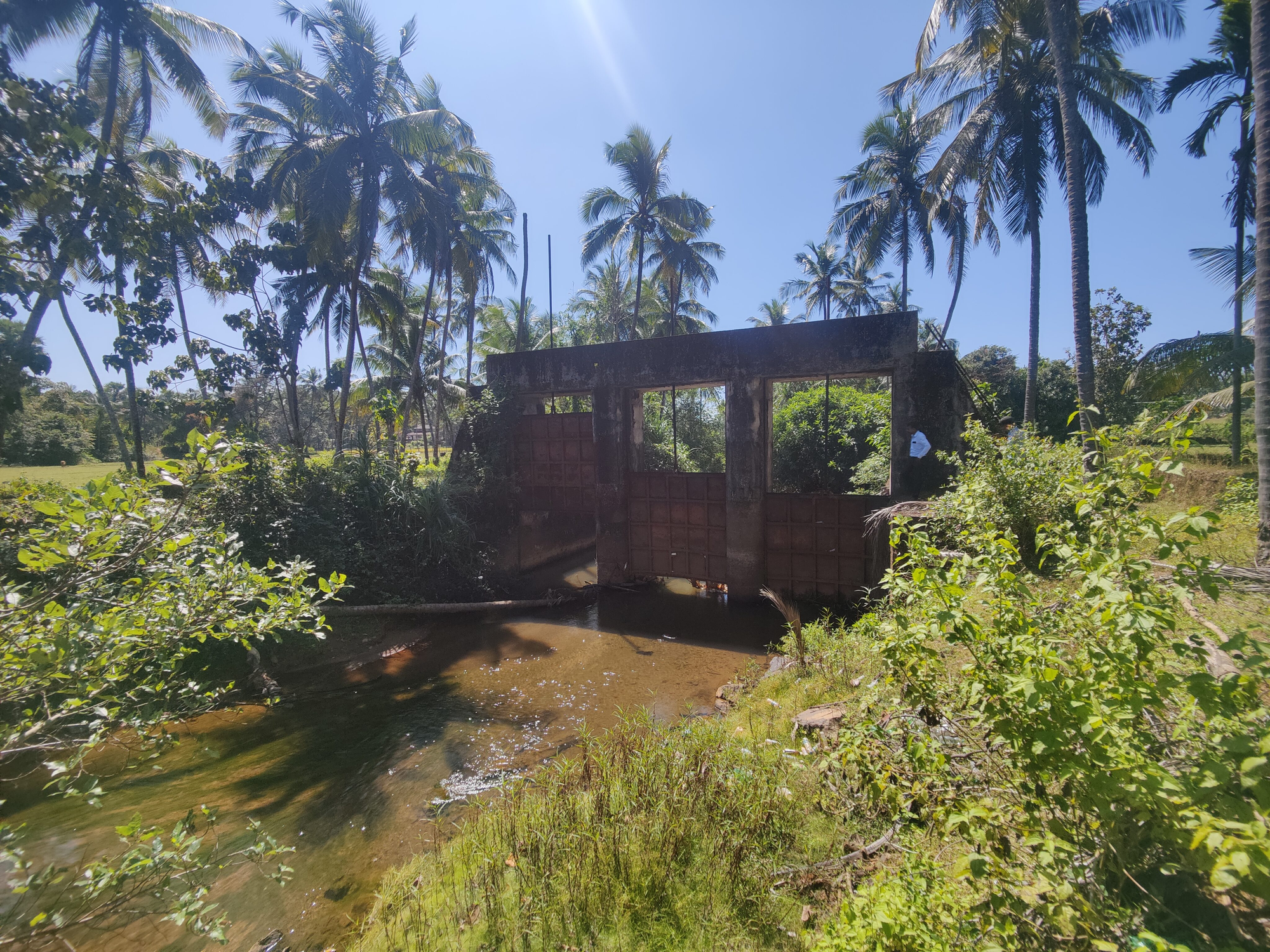 Rajesh drove us down the Aluru-Harkuru road, we passed through the village of Harkuru and about 1.5 km before the road enters the jurisdiction of Hakladi Grama Panchayat, we crossed the Kattinamakki ತೋಡ್ Thod. Right beside the bridge the Minor Irrigation department has constructued a check-dam. This check-dam is not part of the Sowparnika LIS, but is part of the work - planned and maintained - by the Minor Irrigation Department.
