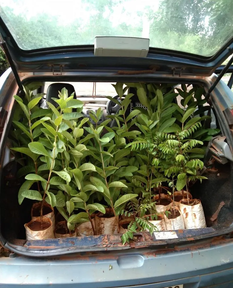 At the start of plantation in his farm, there was no electricity connectivity and no irrigation source. Immediately after planting, rainfall was the only source of water to the saplings. Post monsoon they watered individual plants with buckets and bottles through tank water from a nearby water sources like dabris, seasonal streams and well. In the summer of 2019-20 under Ganga Kalyan Yojana scheme he got borewell drilled at his farm. Which now has become one of the major source of irrigation to his farm. Sometimes draws water from nearby round laterite cut well. Is Agroforestry possible in rain dependent area?. During our conversation he mentioned that most of subsidies and schemes are availed by close aides of local representatives. While browsing through his phone, he showed a image of car and tree saplings. He mentioned this how he transported the saplings from forest nursery to his farm.