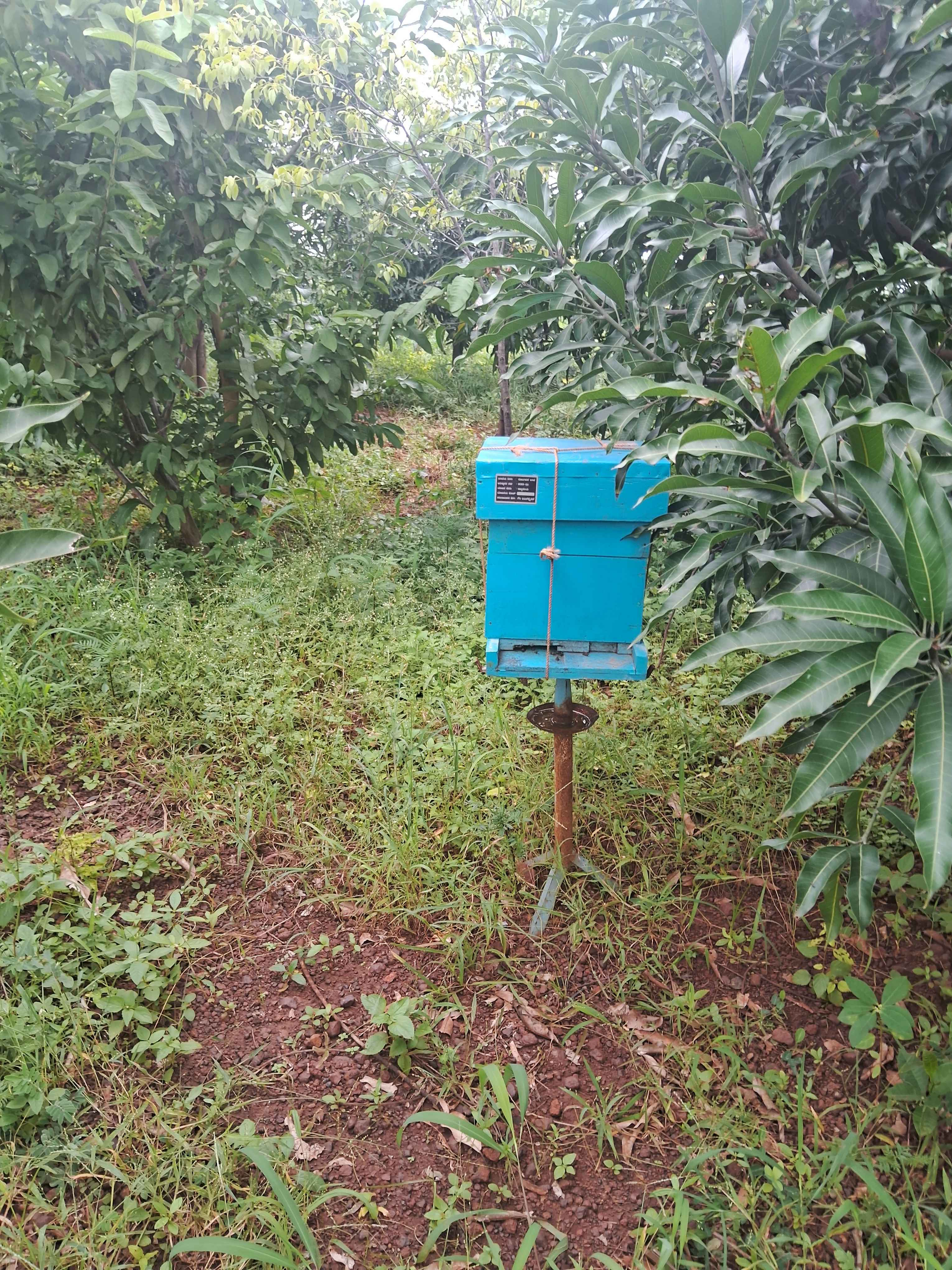 Cover tree canopies help in regulating the sunlight penetration, which indirectly regulates the temperature of the area and creates a shaded area in the field. Many farmers consider shaded area by trees as loss, as growth of crops is reduced under the shade. Here farmers can grow shade loving crops, vegetables and flowering plants. Recent studies suggest that agroforestry helps in sequestring Carbon from air into the soil, which helps in mitigating green house gases. Presence of four Honeybee box at his agroforest farm is added advantage like there is good pollination of the fruit trees and vegetables flower. Good pollination improves yield and increase farmers income. Added source of income to farmer by selling raw and natural honey.