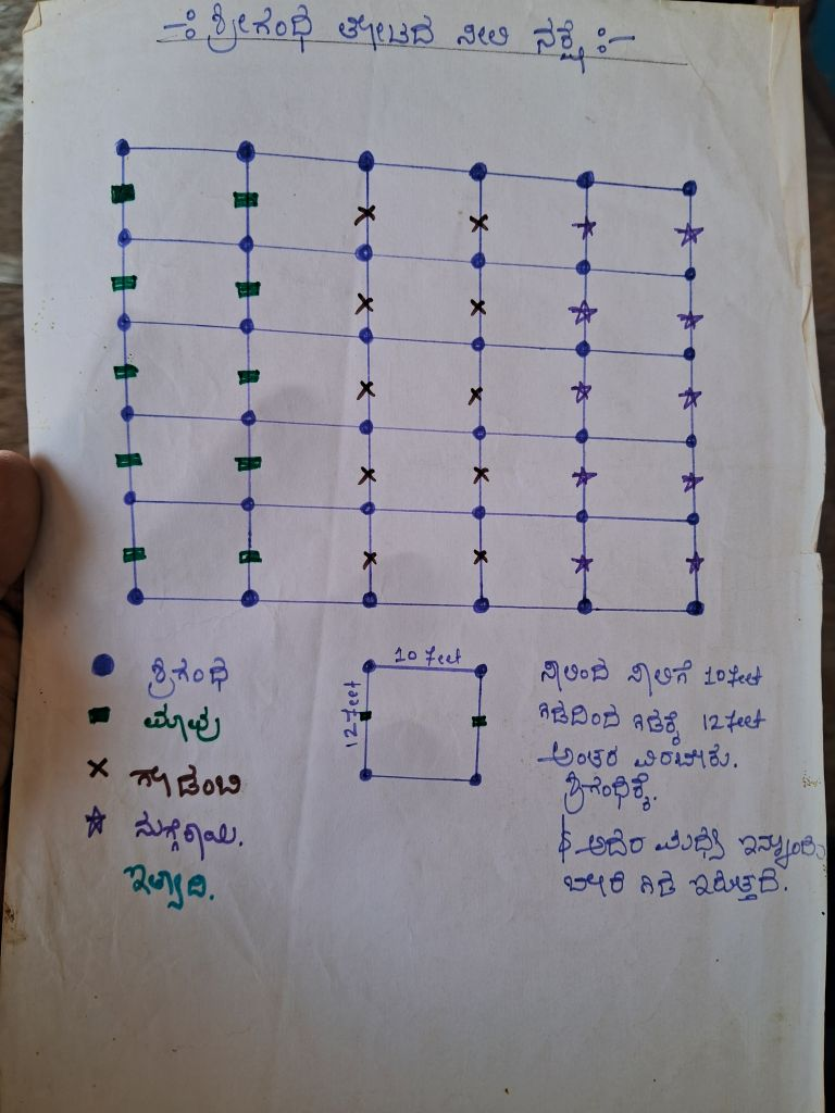 ಮೊಟ್ಟ ಮೊದಲನೆಯದಾಗಿ ನಾನು 2019 -20ನೇ ಸಾಲಿ ನಲ್ಲಿ 2000 ಸಸಿಗಳು ನೆಡುವ ಯೋಜನೆ ಹಮ್ಮಿಕೊಂಡೆ ತದನಂತರ ಯಾವ ಸಸಿ ಹಾಕಬೇಕು? ಯಾವ ರೀತಿ ಹಾಕಬೇಕು? ನಮ್ಮ ಪ್ರದೇಶಕ್ಕೆ ಯಾವುದು ಸೆಟ್ ಆಗುತ್ತೆ? ಅಂತೆಲ್ಲ ಗೊಂದಲಗಳು ಇದ್ದವು ಈ ಗೊಂದಲಕ್ಕೆ ಸಿಕ್ಕಾ ಪರಿಹಾರವೇ ಸಾಮಾಜಿಕ ಜಾಲತಾಣ ಇದರಿಂದ ನಾನು ಸಾಕಷ್ಟು ರೈತರ ವಿಡಿಯೋ ಗಳನ್ನು ವೀಕ್ಷಿಸಿ ಅದರಿಂದ ನಾನು ಕಲಿತಿಕೊಂಡೆ ಯಾವ ರೀತಿ ಹೇಗೆ ಸಸ್ಯ ಹಾಕೋದು ಯಾವ ಸೈಜ್ ಗೆ ಹಾಕೋದು ಅಂತೆಲ್ಲ ಕಲಿತುಕೊಂಡೆ ತದನಂತರ ನಾನು ನನ್ನ ಜಮೀನಲ್ಲಿ ಕೆಲಸ ಶುರು ಮಾಡಿದೆ ಸಾಲಿಂದ ಸಾಲಿಗೆ 10 ಅಡಿ ಗಿಡದಿಂದ ಗಿಡಕ್ಕೆ 12 ಅಡಿದಂತೆ ಗುಂಡಿ ತೋಡಲು ಶುರು ಮಾಡಿದೆ. ನಾನು ಆಯ್ದುಕೊಂಡ ಸಸಿಗಳೆಂದರೆ ಮೊದಲನೇದಾಗಿ ಶ್ರೀಗಂಧ ಅದರ ಜೊತೆಗೆ ಕಾಂಬಿನೇಷನ್ ಆಗಿ ಹೋಸ್ಟ್ ಅಂದರೆ ಮಾವು ಸೀತಫಲ ಜಾಪಳ ಮತ್ತು ನಿಂಬೆ ಹೆಬ್ಬೆವು ಈ ತರ ಎಲ್ಲ ಆಯ್ಕೆ ಮಾಡಿಕೊಂಡೆ ನಂತರ ಜೂನ್ ಜುಲೈಯಲ್ಲಿ ಸಸಿ ನೆಡುವ ಕಾರ್ಯಕ್ರಮ ಮುಕ್ತಾಯವಾಯಿತು. By - Raj Kunche